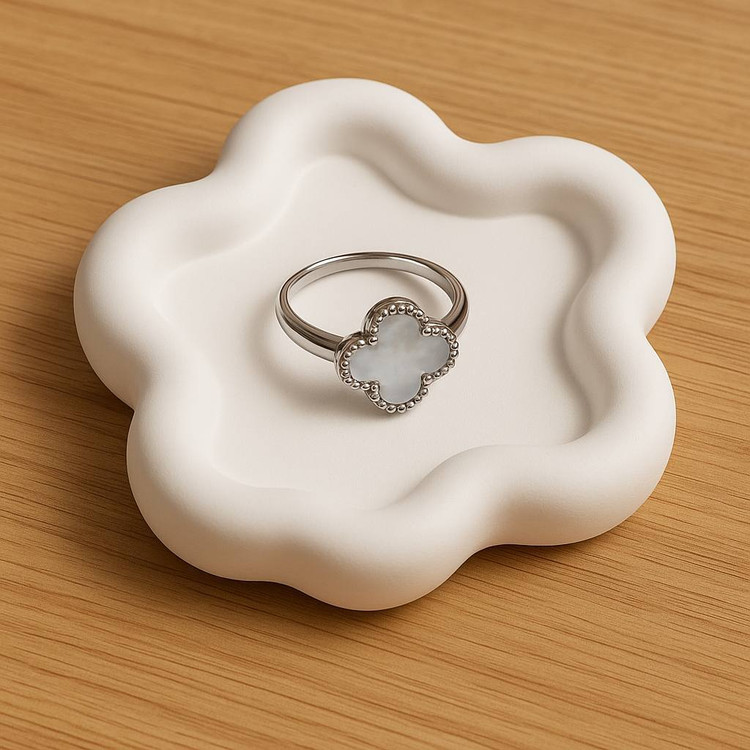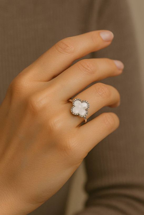 با انگشتر زنانه ونکیلف با سنگ سفید، جلوهای بینظیر و مدرن به دستان خود ببخشید. این انگشتر از نقره ایتالیایی عیار ۹۲۵ ساخته شده و کیفیت درجه یک آن، درخشندگی و دوام فوقالعادهای را برای شما تضمین میکند.